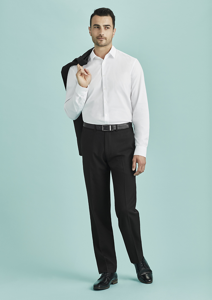 · Flat front and straight through the legs.