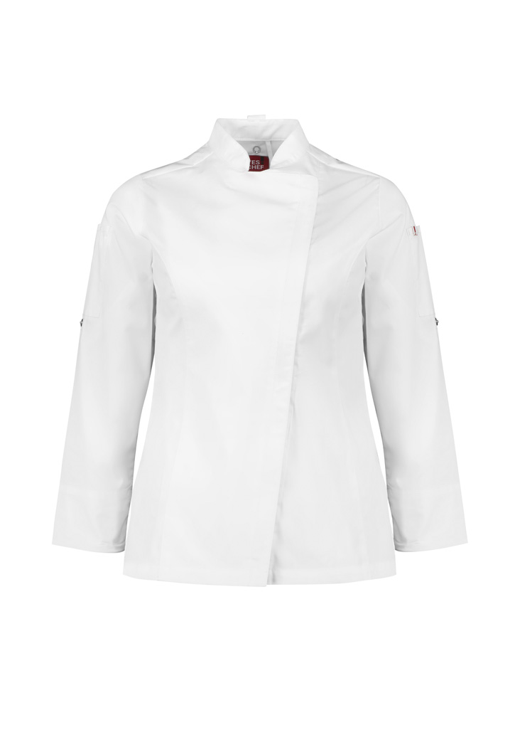- Mandarin collar with apron tab to hold apron in place